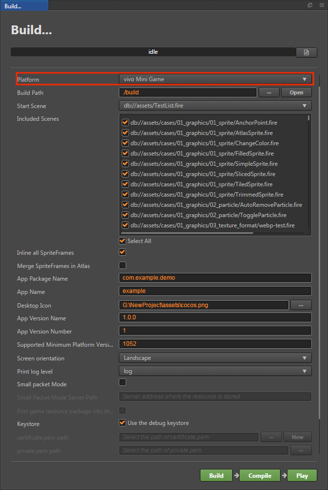 First, use Cocos Creator to open the project that needs to be released. Select vivo Mini Game in the Platform dropdown of the Build... panel.