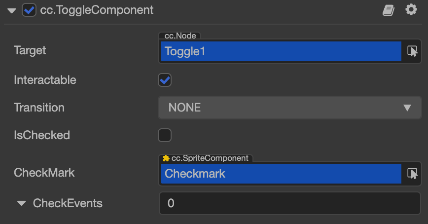 | Check Events | 列表类型,默认为空,用户添加的每一个事件由节点引用,组件名称和一个响应函数组成。详情见下方的 Toggle 事件 部分 |