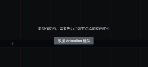 之前我们了解到 Cocos Creator 3.0 是组件式的结构,那么 Animation 也不例外,它也是节点上的一个组件,只有为节点添加动画组件后,才能赋予节点参与到动画的能力。因而点击相关节点后,如果节点没有动画组件,动画编辑器 的界面上将会显示 添加 Animation 组件 按钮,点击即可添加。