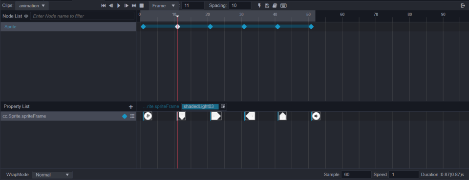 从资源管理器中,将纹理拖拽到属性帧区域,放在 cc.Sprite.spriteFrame 轨道上。 再将下一帧需要显示的纹理拖到指定位置,然后点击播放就可以预览刚刚创建的动画了。